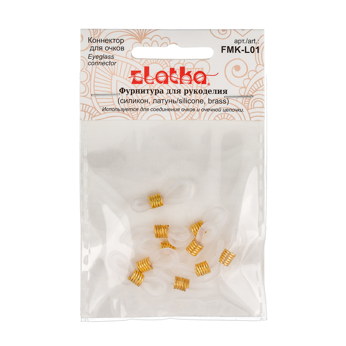 Коннектор для очков " Zlatka" FMK- L01 - это вид фурнитуры для бижутерии и аксессуаров, используемой для соединения очков и очечной цепочки. Подвижная пружинка позволяет регулировать размер петли, надевающейся на дужку очков. Использование качественной фурнитуры играет очень важную роль при изготовлении бижутерии. От правильного выбора коннектора, замка или любой другой связующей части зависит целостность готового изделия. Размер 19. 5 мм. Толщина основы: 1. 8 ммПружинка: 4. 4 х 4 ммКоличество в упаковке: 10 шт. Состав: силикон, латунь. Сообщить о неточности в описании